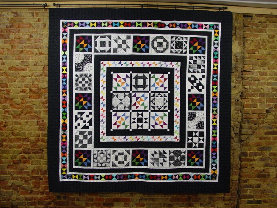 | Design Source - Description | Another Kansas Prairie Shop Hop Quilt. Made in 2007. Each shop exchanged black and white quilt blocks that were mirror images of each other. Just felt the quilt needed some color. |