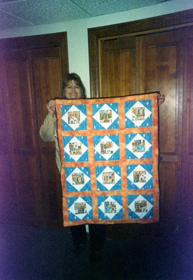 | Design Source - Description | Traditional Diamond in a Square block showing various southwestern pueblo scenes created for a dear friend of mine, who is holding it. |