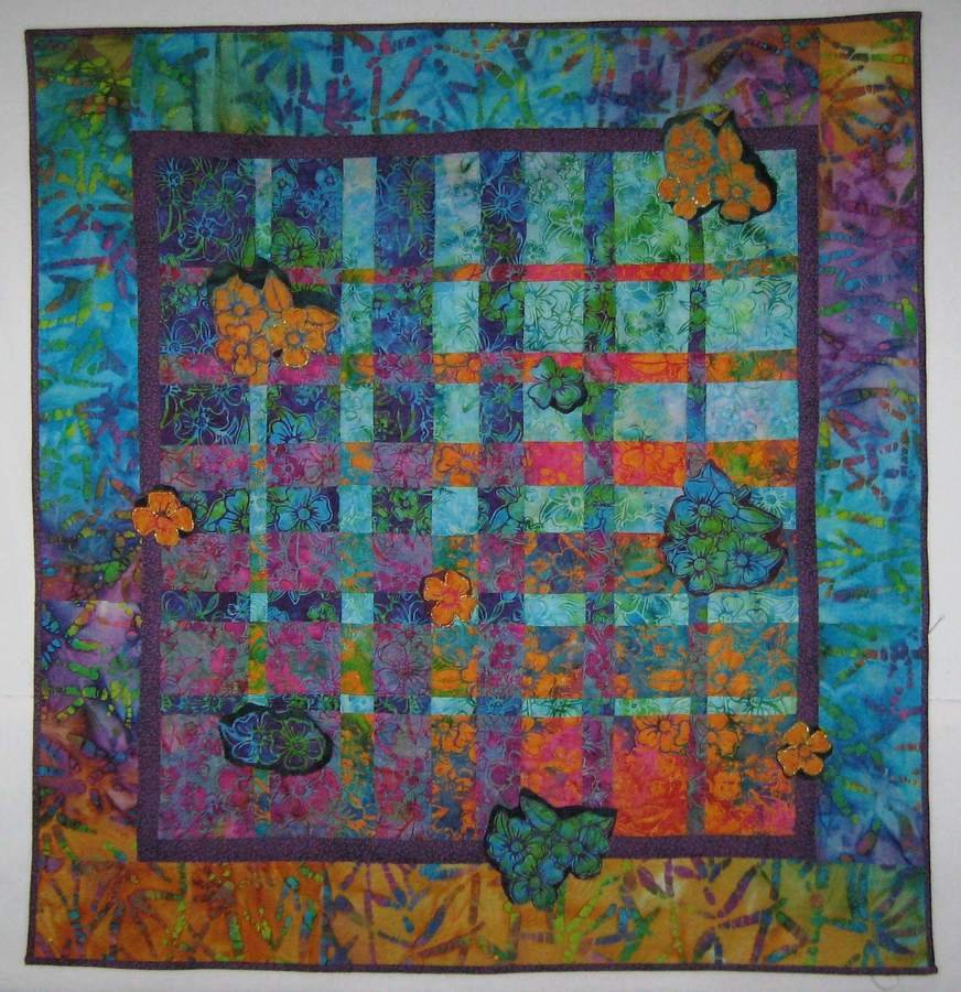 nyneve A Convergence of Dogwoods - I used dogwood themed batiks from a shop hop. I embellished the quilt with a border, padded appique and gold braid around some of the appliques. The quilting is motiff quilting for every other row with rectangular patterns in between and extremely detailed echo quilting in the border.