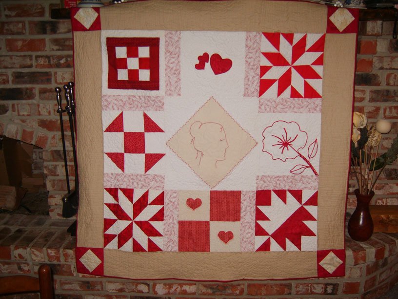 dragonflye Rae's Redwork - I used a variety of traditional blocks donated from friends and a few of my own designs for this quilt. It was made for my aunt, who lost everything in Hurricane Rita, in Creole La. The center was hand stitched by me in red perle cotton. The first two blocks in the top row, and the third one on the second row were done by me. The others were done by good friends from an online quilting email group that I have belonged to for several years.. Marcie Cutrer of Denham Springs LA, Tania from New Zealand, Annie Lewis of PA, Donna Staby of PA, and Margy Collingwood of the UK. An extra block made by Norma Daniels was made into a pillow to go along with the quilt. The machine applique block at the center of the bottom row reads "thinking of you across the miles" and it was made by Tania in NZ.