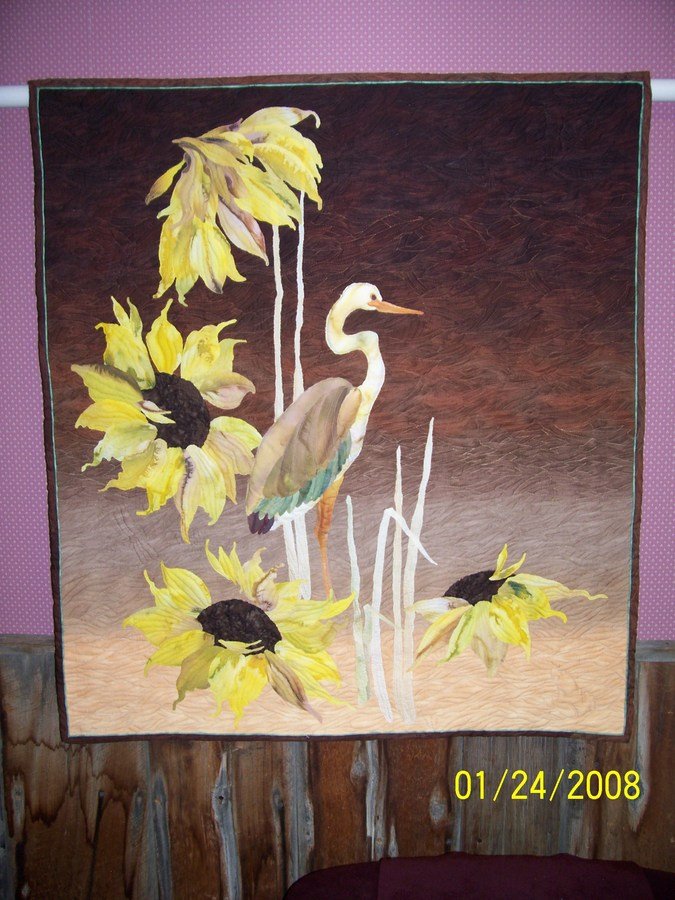 reginajo My Blue Heron - A class with Phil Beaver at "Quilting in the Tetons" October 2006. Fabric in the flower pedals & heron was hand dyed on frames -- very amazing...! A friend suggested that every blue heron need a frog to eat! That inspired the inclusion of 6 animals hidden in the machine quilting. Can you find them? The quilt was finished June 2008. Thanks Phil for sharing your talents!