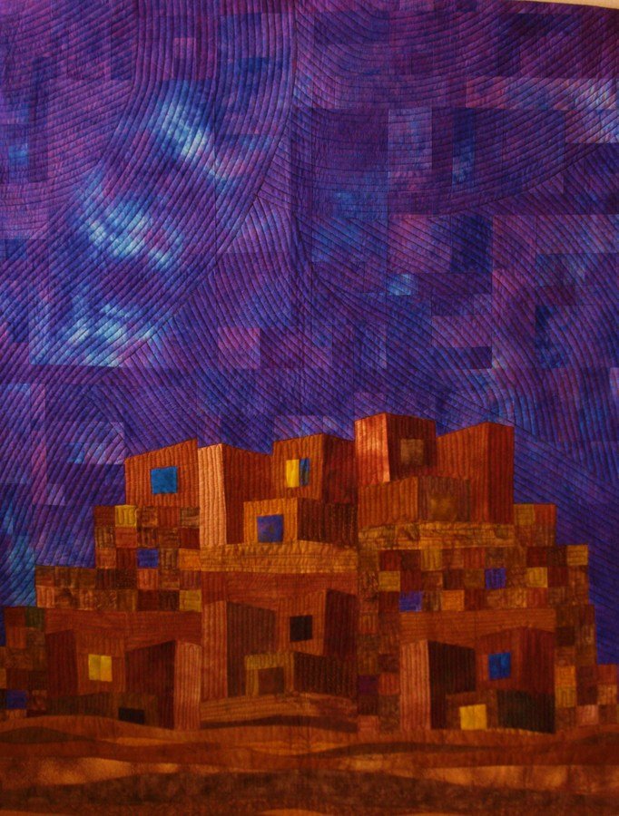 TQSWizard Inn at the Loretto - This is the first in a series of dwellings I am working on. It is an adaptation of the Inn at the Loretto in Santa Fe, New Mexico. This piece was begun at a Ricky Tims retreat. I hand dyed about 70% of the fabrics in the building. The sky fabric is Ricky's hand dye cut into different size pieces to create the look of an lightning storm so often seen in New Mexico.
