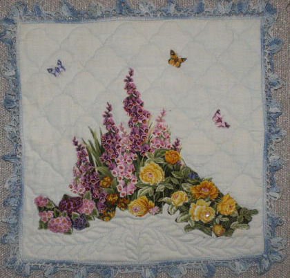 Stinki Aunt Hazel's Appliqued Hankie - This plain blue hankie with blue crotched border belonged to my Father's Aunt Hazel Harrah-Fuller. She was a dear, sweet soul. I was inspired by the TQS show on quilting antique linens and decided to pull this hankie out of hiding and quilt and embellish away!