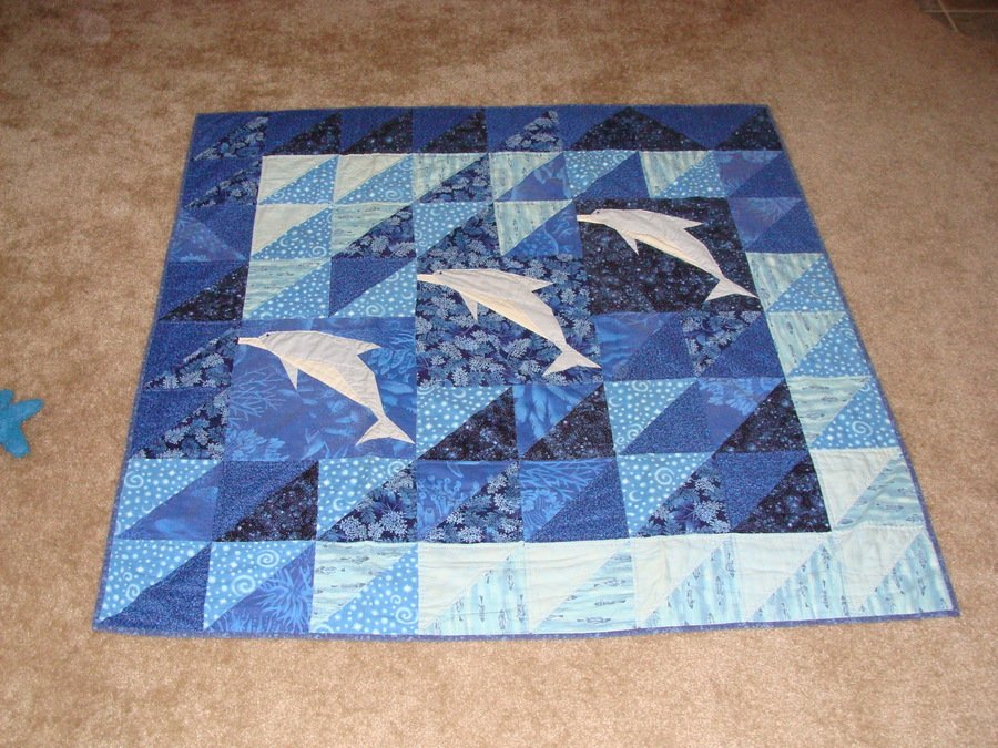 | Design Source - Description | My second quilt, made for me. Handquilted without a frame. My first mitered binding. I was going through my dolphin phase! |