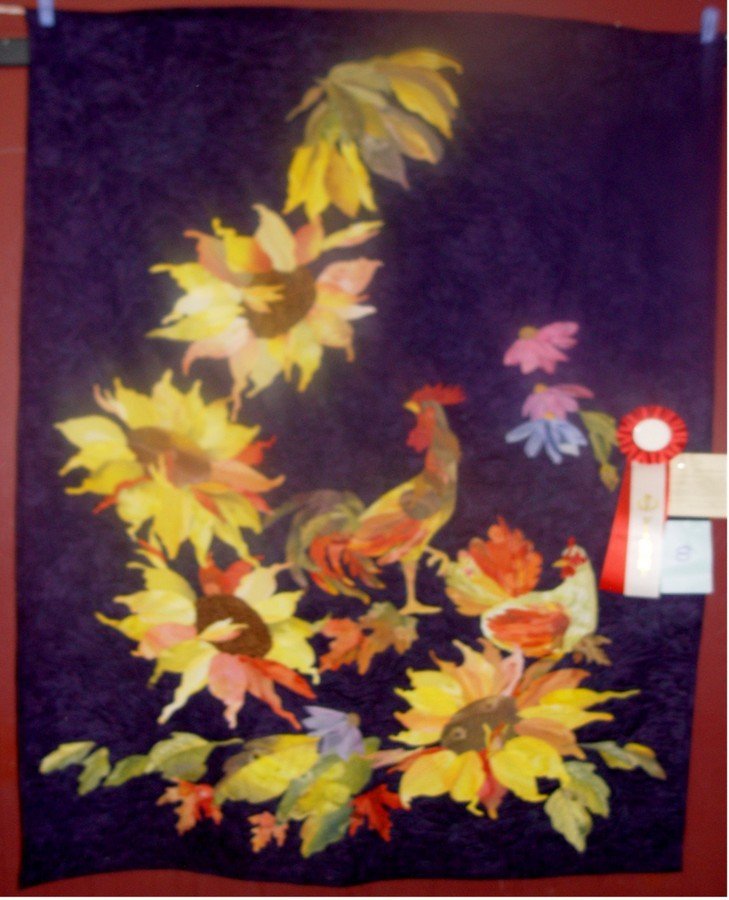 Rhoda Sunny, Sunny Day - I learned to paint fabrics in a workshop by Phil Beaver. All the fabric used was handpainted by me. The design elements are his patterns and I put it together and did all the machine quilting and thread painting.
