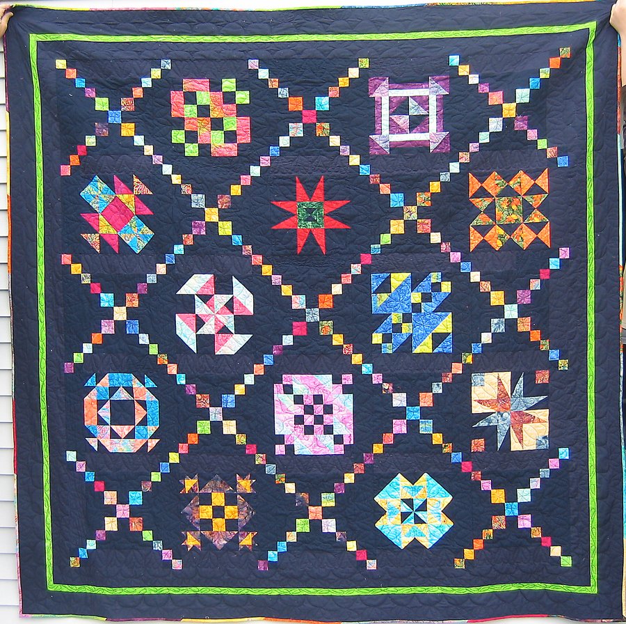 Colleen Patience is a Virtue - This was a Saturday Sampler from my LQS. The alternate blocks were based on the Millenium Sampler designed by Patchwork Studio. I quilted it on my HQ16 - it was TOUGH, because the quilt is queen sized (about 108 inches square) and my table will only allow about 7 feet (84 inches) of width. Hence, the name.