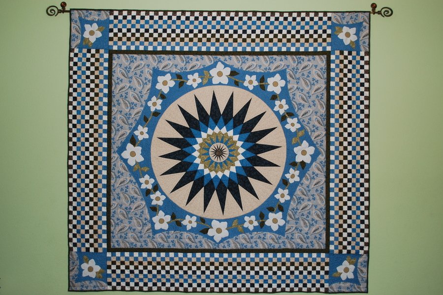 | Design Source - Description | I was inspired by a Judy Mathieson Mariner's Compass class and modified one of her patterns for the center. I didn't want to set it in a square, so I hand and machine appliqued the background around the star. |