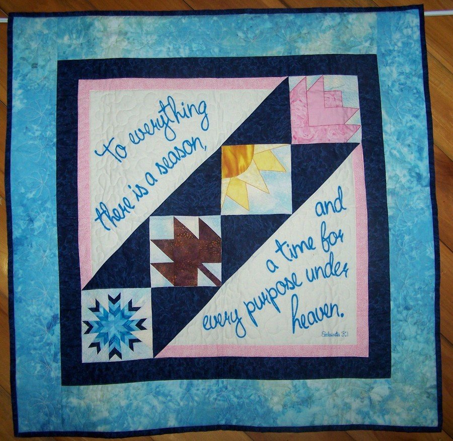 linmcquilter Everything a Season - I purchased the pattern and panel from Block Party Studios, Inc. The snowflake was challenging but I really like the way it came out. The sun proved to have low contrast in its block, as well as the pink flower, so I outlined both with embroidery. This makes a lovely wallhanging in our church.