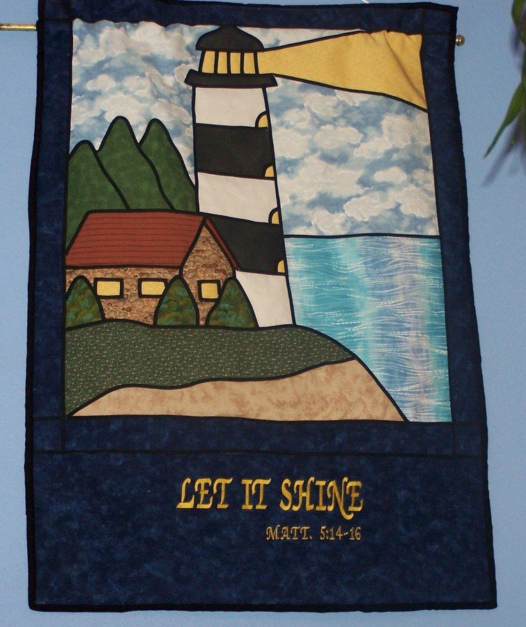 linmcquilter Let It Shine - Constructed this wall-hanging to hang in the entryway of our church in Bayfield, Wisconsin, which is the gateway to the Apostle Islands National Lakeshore. I had the lettering and Bible verse embroidered on professionally. Matthew 5:14-16 reads: "You are the light of the world. A city on a hill cannot be hidden. Neither do people light a lamp and put it under a bowl. Instead they put it on its stand, and it gives light to everyone in the house. In the same way, let your light shine before men, that they may see your good deeds and praise your Father in heaven."