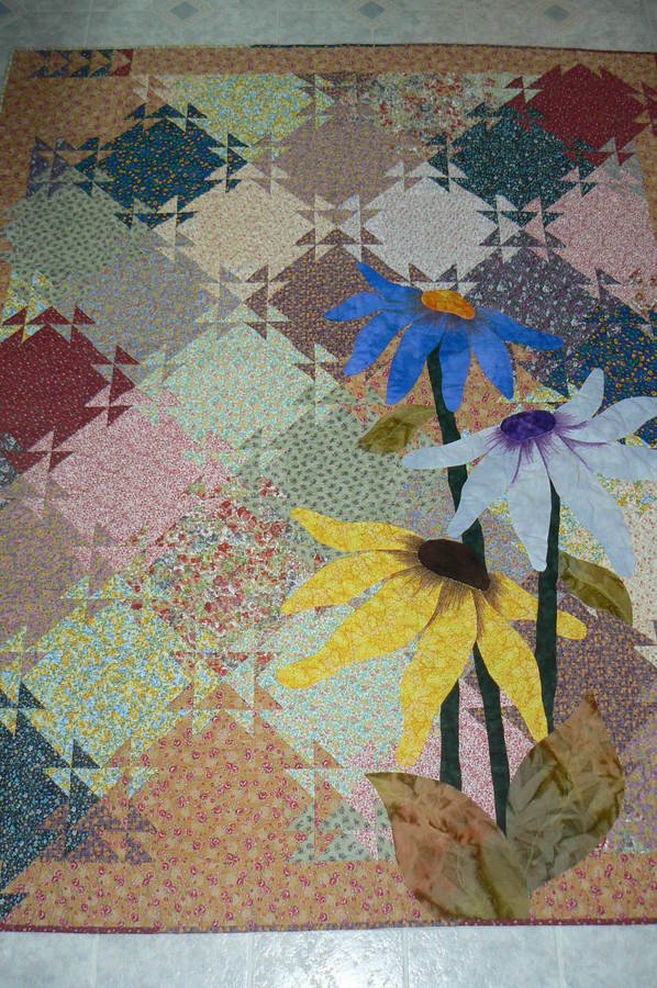 Cher4 Floral Glass Blocks - A friend made a deal with me. Since she was going to be unable to do anymore quilting. She would trade me her stash and in return I make her a quilt for her bed. Last fall when the first installment of fabric arrived It was mostly florals. While I'm thinking, what am I going to do with this? My mom is looking at each one and saying, this is nice, oh this is nice. so I decided I would make mom a lap quilt for Christmas. I made lots of half square triangles and 3-d flying geese and made blocks of all the different floral fabrics. Then deciding it was missing something, it just wasn't me, I added the flowers. I used wool batting for the first time and have decided I love it. And mom loves her quilt.