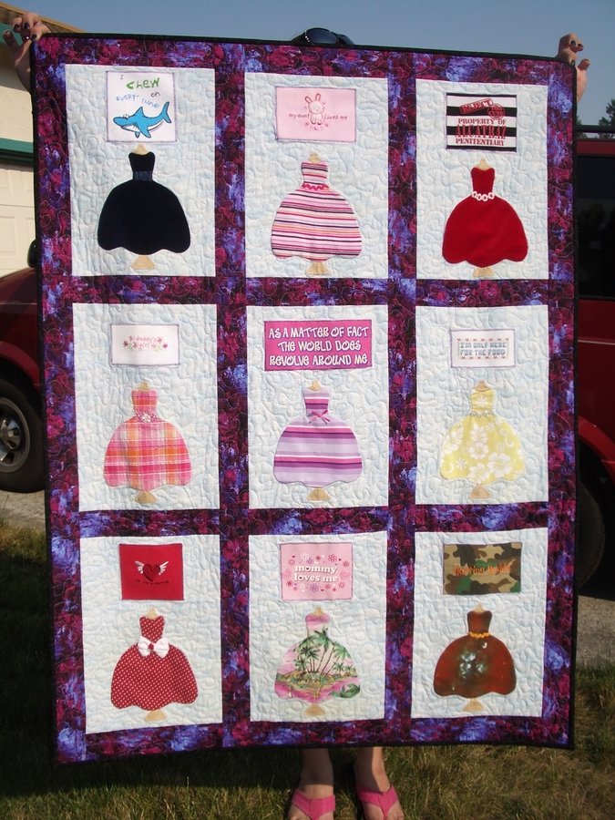 quiltnmama Dresses throughout the years - This dress pattern was a friendship block at my quilt guild. I thought that it would be a perfect pattern to use with my neice's baby clothes. All of the dresses and the banners are clothes that she wore (onesies, t-shirts, dresses, bibs and even her first Santa hat). I have since been hired to make similar quilts and it prompted me to start up my own website www.quiltnmama.com.