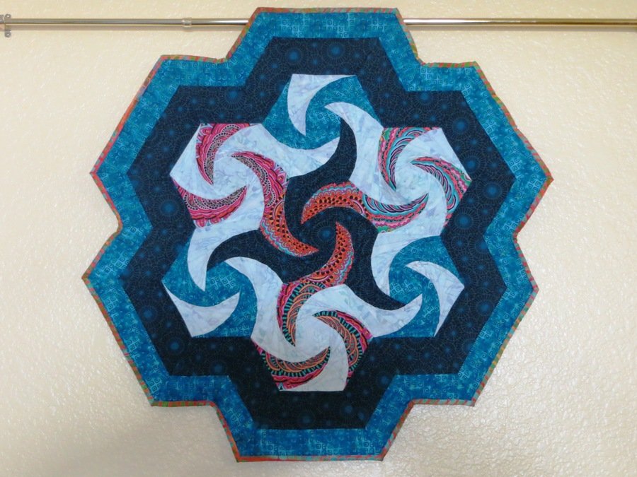 quiltnmama Invigilation - This is my 2014 entry for the Hoffman Fabric Challenge. Started the quilt in October of last year. It is 100% hand made. The pattern was drawn by hand. The pieces were cut out with scissors. The top was pieces by hand. This is my first hand quilted project. The binding was sewn completely by hand. Boy do I miss my machine!