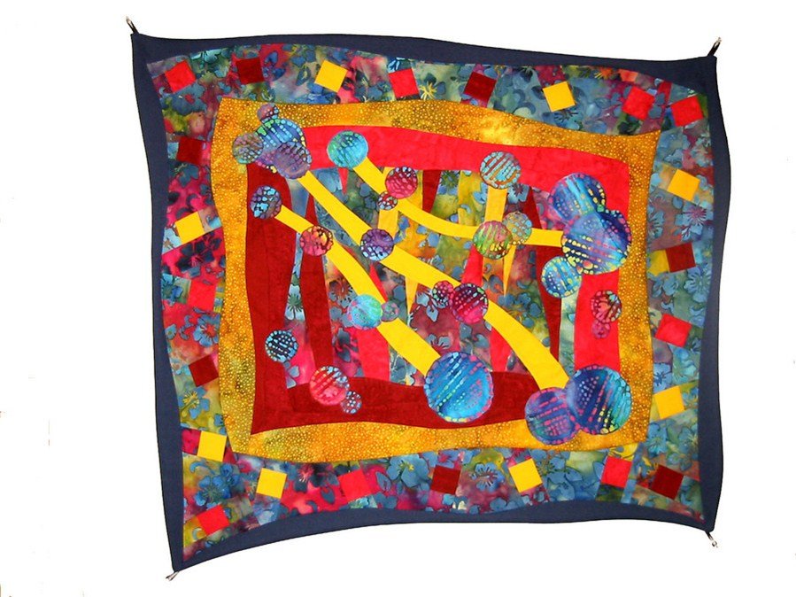 Jolet WonkyWorks13 - This is also a fairly early wallhanging, and at the time I didn't think that much of it, but it's one of my favorites now. I did alot of experimenting and cutting through. The batiek balls were fused on afterwards and I couldn't stop adding them! Since I have run out of wall space, alot of my wallhangings are in a drawer, but this one is always out.