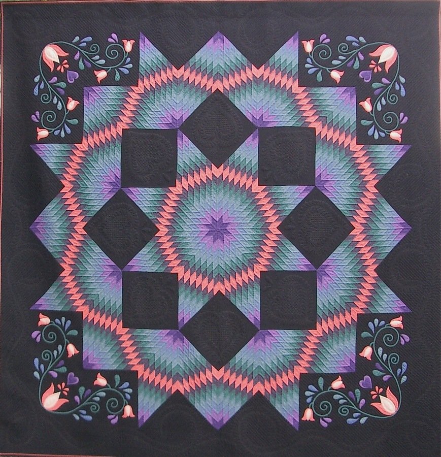 LCCampbell Pennsylvania Dutchess - I love STARS! I discovered early on in quilting that I needed to use solid color fabrics to show off my hand quilting stitches, and I learned that black shows off colors and makes the glow. A little applique added to a pieced quilt makes it all come together. This quilt was my first really big winner in competition. It is retired now, and at 108" squares, it is too big to be a regular part of my trunk show, so it lives at home mostly. I will sometimes take it with me when I drive to my teaching/lecture bookings.