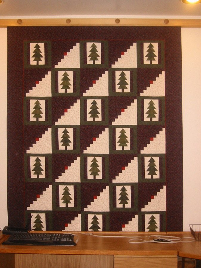 MontanaGramma Northern Reflections - The trees in this block were paper pieced - my first attempt at that and I really enjoyed it. About the time I was making this, I watched Susan Cleveland on TQS. So I used her piping method to make a burnt orange border between the blocks and the border.