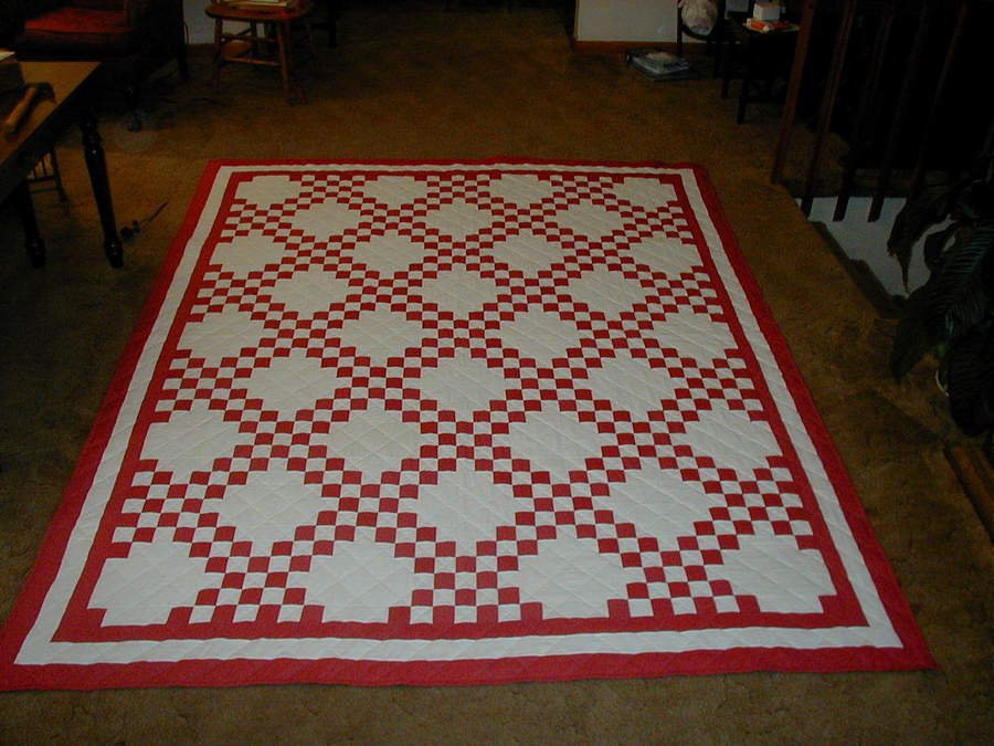 sandytn Melissa's Irish Chain - I made this quilt for my daughter to use for a bedspread. I finished the quilt twice. The quilt was not large enough for their queen size bed so I took off one side, added two more rows to the width, reattached the borders and quilted the additional rows and rebound it. The quilt measures 82" x 104. Mom and dad helped me put the quilt in mom's quilting fram and mom helped me quilt it. Mom and dad would come to my house each afternoon after I got home from work and we would quilt for a couple of hours. She was in the early stages of Alzheimer's and I had to mark a line for her to quilt otherwise she would get confused. It was the last quilt she worked on.