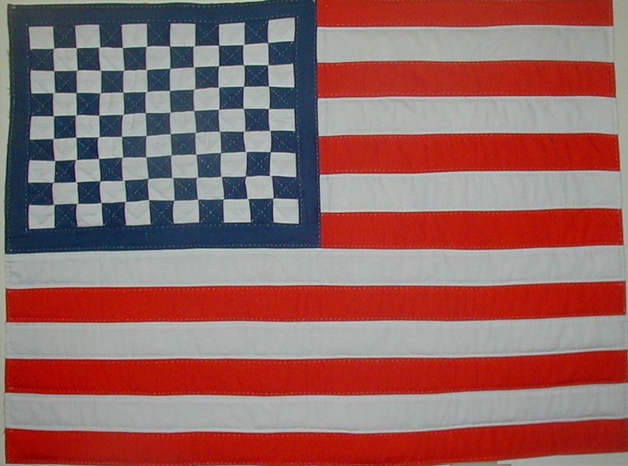 sandytn State Quarter Flag - I adapted this flag from a pattern in Better Homes and Gardens, Quilting Ideas 2002. The white fabric for the stars representing the 50 states are folded to hold each of the 50 State Quarter being released from 1999 through 2008 by US Mint. I made a second one in 2005 and donated to the ORNL Alzheimer Auction.