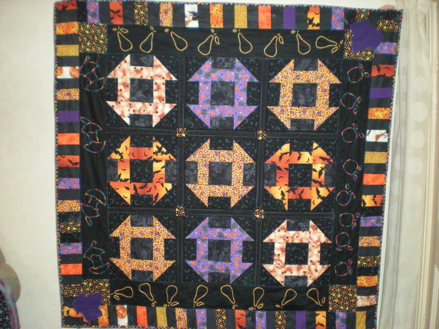 This is my Halloween quilt lots of Halloween fat quarter that I was saving for this project. All around the edge I embroidered apples and pears. |