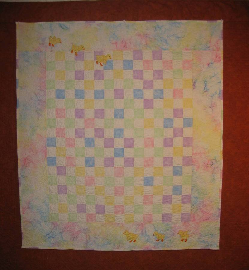 cblong03 Baby Quilt for a Colleague - I made the top at our guild's quilt camp weekend, my first since joining the guild (not my last, for sure). Being one of those who usually ends up doing things the hard way, I wasn't satisfied with a typical nine-patch layout. Fidgeting with the color placement took far longer than I intended, but I think it adds interest. My roommate for the weekend found the perfect border and backing fabric at the area's local quilt shop. I was so excited and grabbing bolts of fabric at this new-for-me shop, I would have missed this perfect fabric just a foot or so away from me! After my fabulous first time at quilt camp, I got to practice my free motion quilting. The "mindful meandering" quilting design in the borders was from the book of the same name by Laura Lee Fritz. Unfortunately, I had saved and cropped a picture of the just the ducks from the internet without having gotten any information about them. Therefore, I have no idea who designed them. I'm sorry for the lack of credit to whomever you are!!! If anyone knows, please let me know, so I can properly credit this person.