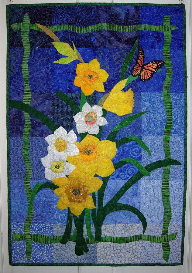 Sallyquilts A Host of Golden Daffodils - This quilt was inspired by a workshop with Ann Fahl at an Empty Spools Seminar at Asilomar, CA. The design was sketched by my husband from various photographs. It is fused applique' on a patchwork background, thread painted and beaded. The butterfly is 3D - thread painted on organza and applied.