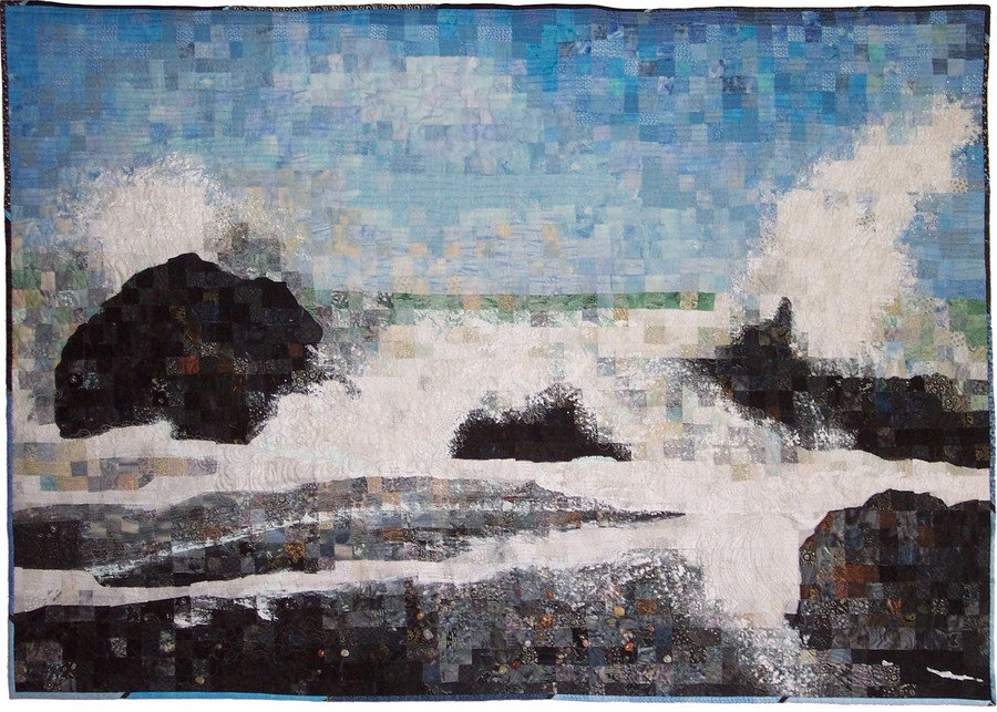 Patsquilts Agate Beach - This is it. The very first quilt that I tried my Mosaic Picture Piecing method on. It was a complete experiment. Would it work? I was pleased and was encouraged by my friends to teach the method and eventually to write a book about it. The inspiration picture, taken by my husband, was of Dry Lagoon, where we search for agates in the unusual sand.