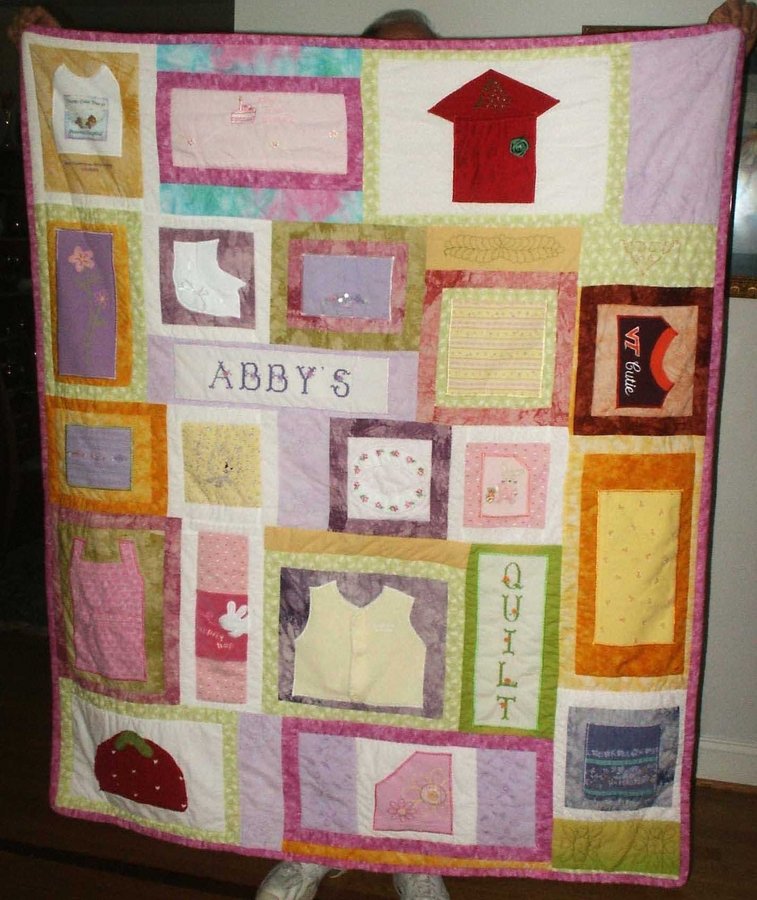 | Design Source - Description | The blocks were appliqued on by machine depending on size of outfit, then sashing was sewn between the blocks. Outfits were from Abby's collection of baby and little girl clothings. |