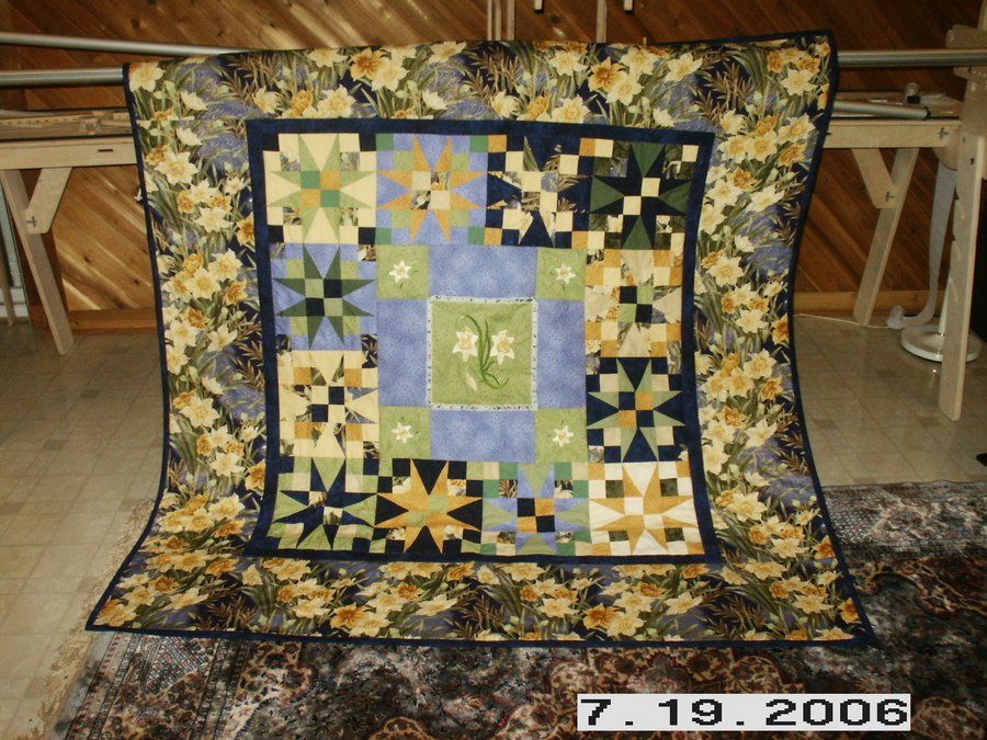 Diamondwife Daffodils Delight - This quilt was especially designed for Virginia Garden Society as an auction item by Ginger Wallach. She wanted to have daffodils (6 stems only) in the quilt. Used Kona Bay fabric and embroidered the other daffodils on my machine, including the center block and small corner blocks in the middle of the quilt.