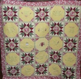 quiltngfrk No Name - The quilt was designed by Lisa Connelly to be auctioned for school fundraiser for 7th grade project. "Contrary Wife" block from EQ6 was used in every other block. Opposite blocks a Psalm was embroidered with varying designs. In the middle of the quilt the school emblem was digitized and embroidered.