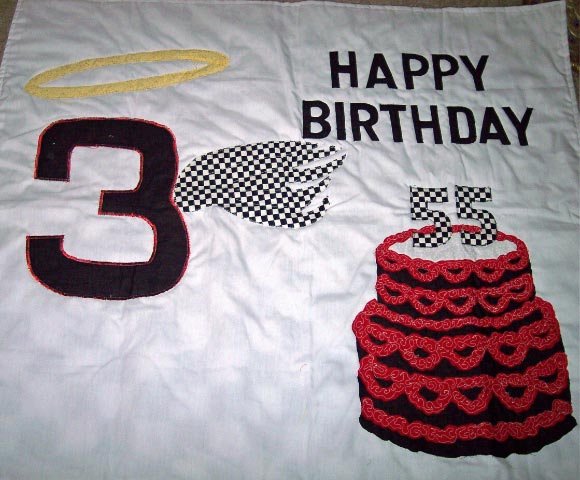 PattyS Happy Birthday Celebration for #3 - Being a NASCAR fan of the late Dale Earnhardt I made this for my husband. On the 3rd lap of the Spring Race at Talledaga there would be a lap of silence. It was during this time we held our banner up high!!