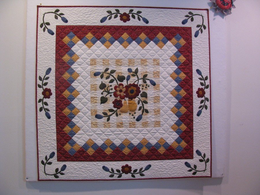 | Design Source - Description | I started this quilt at our winter retreat. I machine appliqued all the pieces. I had it long arm quilted by two ladies in Bonners Ferry, ID and am just thrilled with the work that they did. |