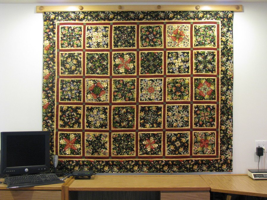 MontanaGramma 4-Patch Posies - I enjoyed seeing how each block comes out different using this method. I quilted the posie blocks by using a Holice Turnbow quilting design and my embroidery module. I then drew a floral design on quilting paper and used my BSR foot to quilt the borders. I am not that pleased with my quilting work but had to start somewhere.