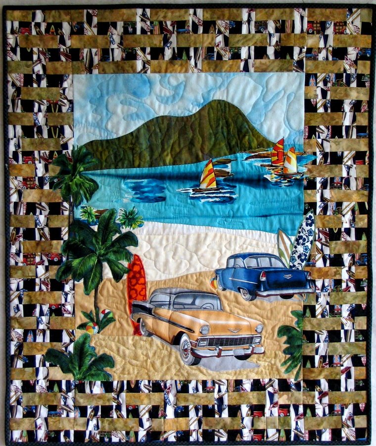 | Design Source - Description | Inspired by a commercial fabric with old cars, surf boards and woven basketry, I designed a beach scene using other fabrics. |