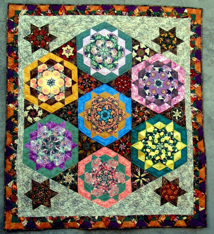 ocdquilt Western Wildflower Garden - Fabrics for the seven kaleidoscope blocks made from photographs of wildflowers and cactus from my garden and other locations near my New Mexico home. Arrangement of blocks as shown in Sara Nephew's book, Serendipity Quilts.