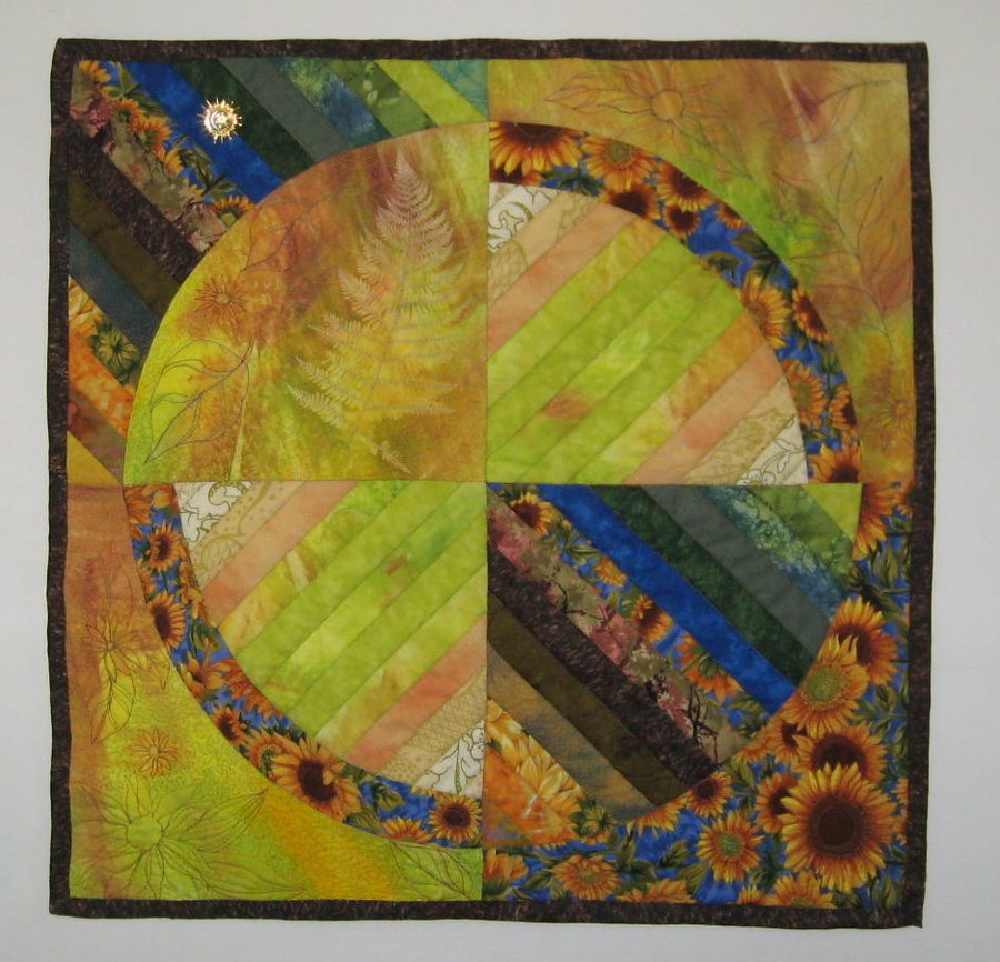 ocdquilt Sunflower Summer - Pattern printed from TQS website. Designed by Louisa Smith, a pattern similar to those in her book Strips and Curves. I used some hand-painted fabric enhanced with sun prints using leaves and Seta Color transparent paints.