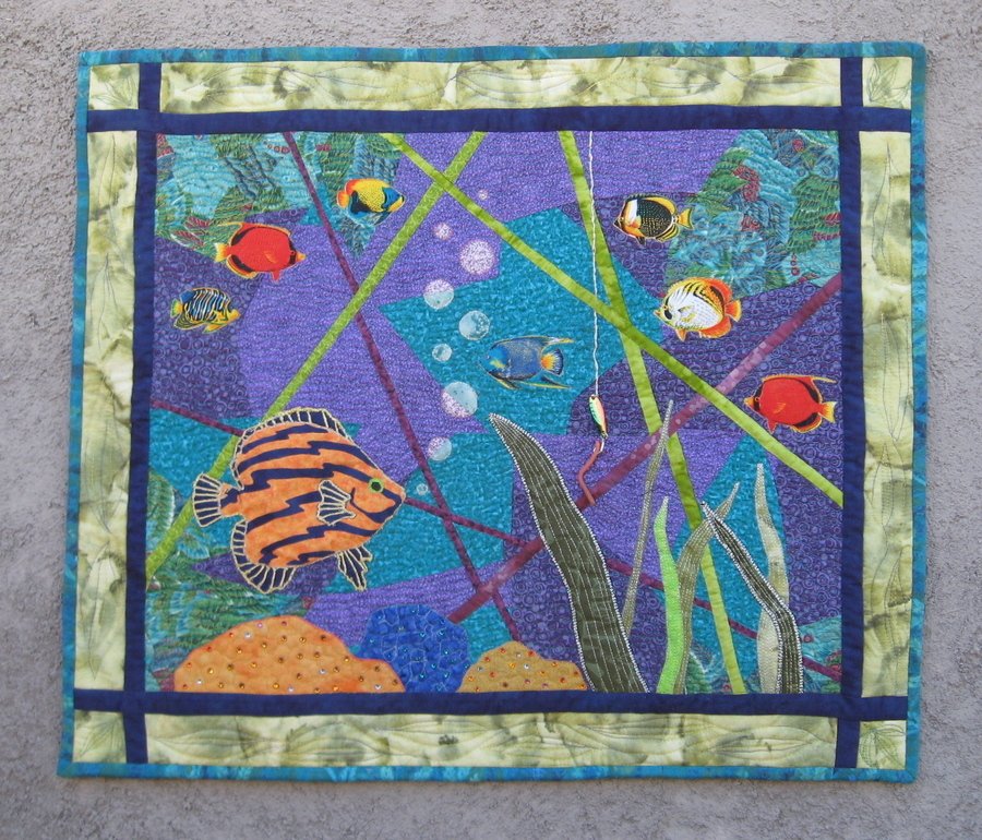 ocdquilt Seams There's Danger Ahead - The background of this quilt started in a workshop in my local quilting group using a rotary cutter with no ruler as a guide. After sewing the pieces together it looked like an underwater scene, and the design progressed from there.