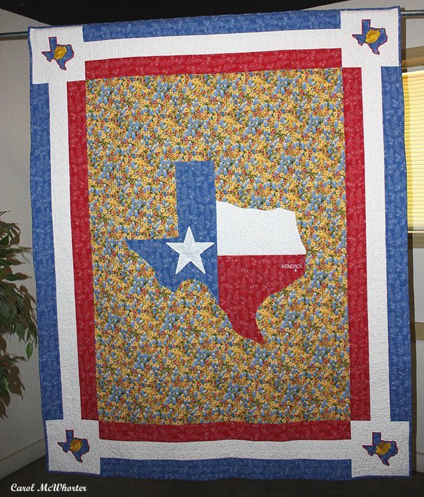 etxquilter Texas Kenefick Texas - Quilt was made for the auction at the annual fund raiser for the Kenefick Volunteer Fire Department and Kenefick Civic Center 2010. Made with various bluebonnet fabrics. The town of Kenefick was machine embroidered on the state.