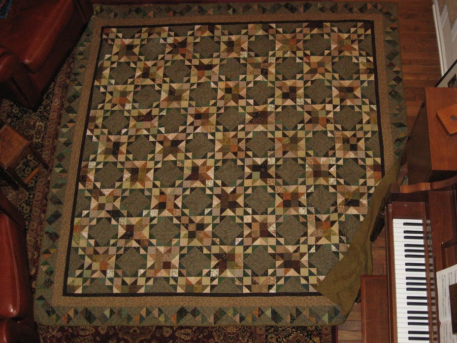 hsvjean Green Mountain Stars - I pieced the top in 2007 over a number of months. It is going to be used in our bedroom with our antique oak furniture. This quilt challenged me. I struggled with the border, but I finally conquered it and took it to my long-arm quilter. She called me this summer (2008) that it was ready. I put the binding on the next day. I love it.