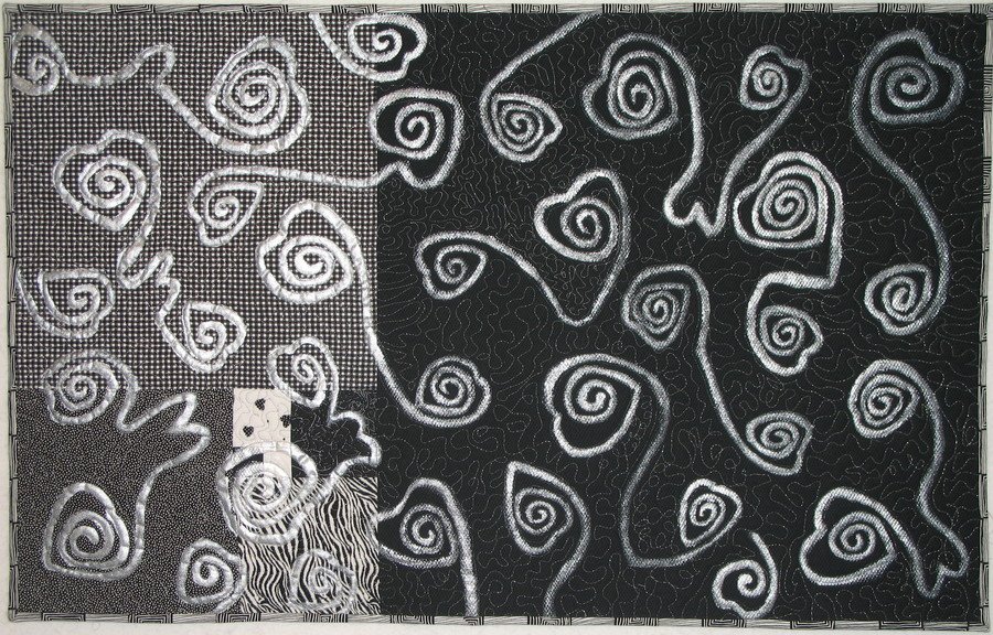 Sparkler Playing with Fibonacci - This quilt is a bit of an experiment. It's black and white and I always work with colors so this is a first. I used Fibonacci squares, which I've never done before. I painted another layer of design all across the top - the spiral hearts - which I've also never done before.