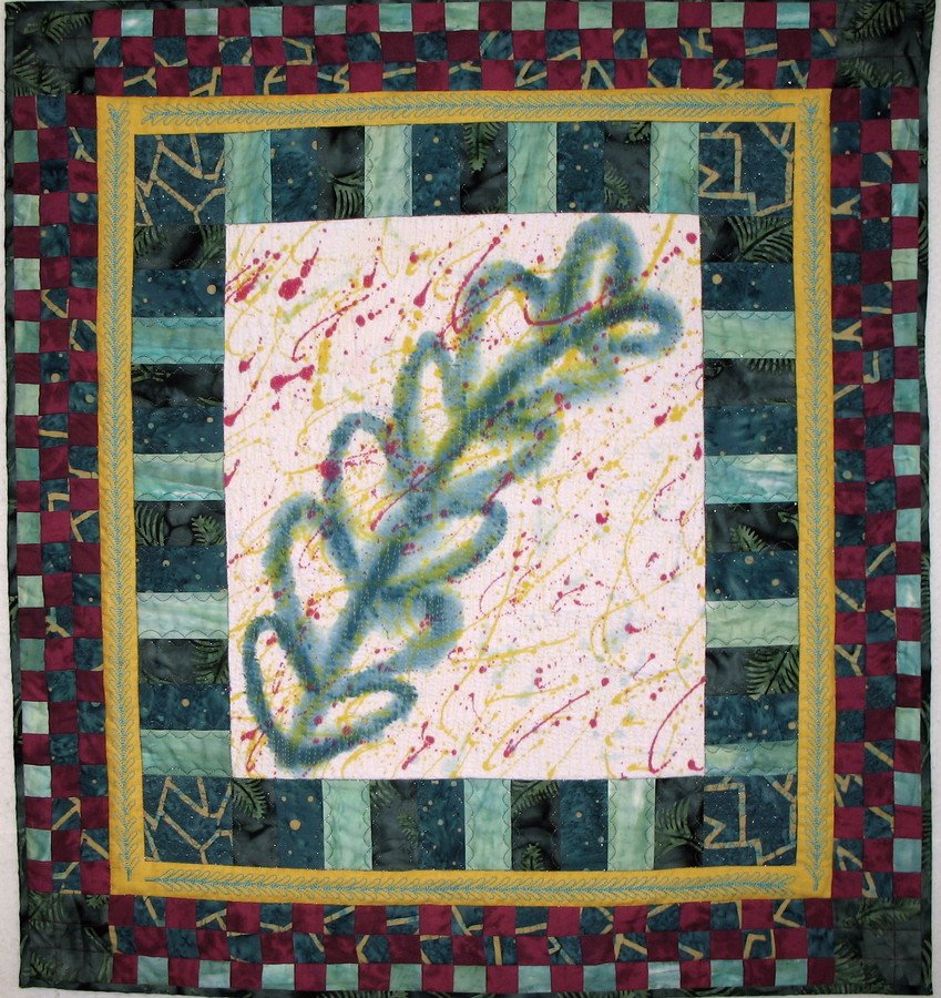 Sparkler It Feels Like Spring - I took a surface design class this spring in which I hand-dyed the center motif. I liked it so much I decided it just had to be made into a quilt and this is the result. When I thought the top was finished, I felt that the narrow yellow border was too strong and I needed to tone it down. I finally decided to machine embroider it with turquoise thread; much to my delight I found a built-in stitch on my machine that was very similar to the motif I had dyed. I just love serendipity!!!!