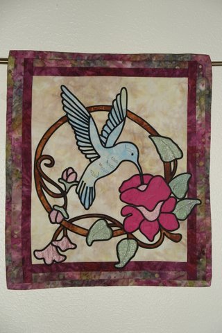 Lystger My spring hummer - This is my first attempt at a stained glass wall quilt. I used my own fabrics and played with the overall effect. I did learn a lot doing this pattern, and am pleased with the outcome. I, like lots of others, love hummingbirds so this hanging makes a good addition to our home.