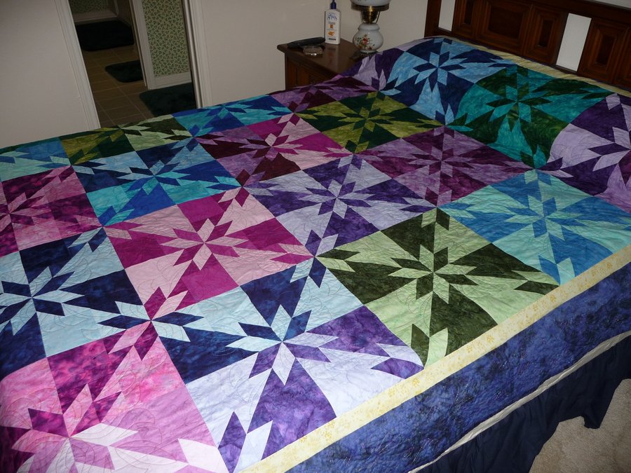 Lystger Oregon Star - I purchased this pattern while spending our summer in Oregon, on the coast. My husband fell in love with it - so I mixed the colors differently and dedicated the quilt to him. He is the star of my life. The original had all colors mixed together, and in mine I kept each star with a couple of shades of the color spectrum, then let them fall where they may in the final layout. We love this bright, cheery quilt.