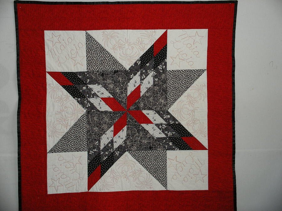 Lystger Maia's Star - My 18 month old niece who had had an aneurism, was in a coma. They wanted to stimulate her vision. So I made this wall/cuddle quilt of black, white and red for her. Her name is Maia which is the name of the brightest of the seven sisters star constellation. Maia is still struggling to overcome her problems, but is out of the coma and seeing things around her. Hopefully this quilt will help with her therapy while comforting her at the same time.