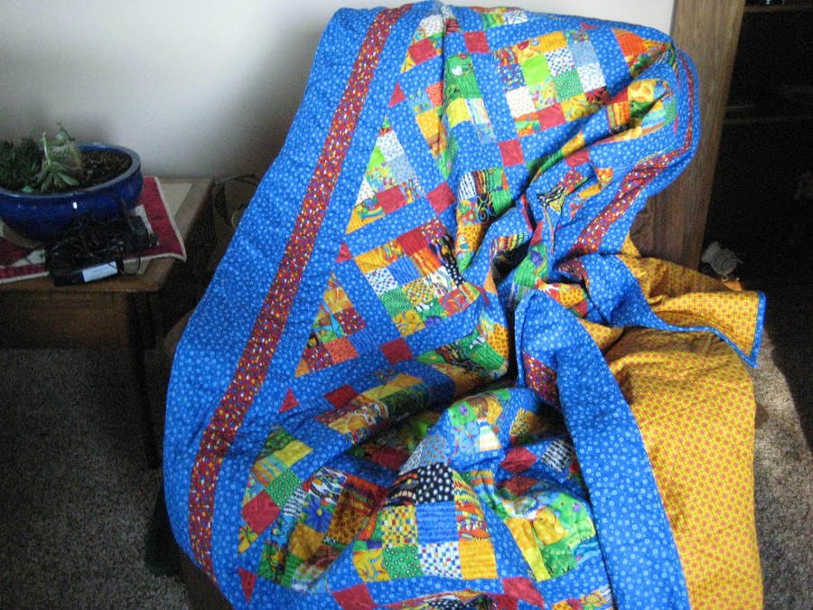 Momgunter Andrew's Eighth - Andrew's quilt was made for his special eighth birthday. It provided several challenges for me and some mistakes which haven't diminished his love for the quilt one bit. I learned a lot about "busy" fabrics. Both front and back are busy and I chose thread which blended so well that I had trouble keeping track of the quilting.