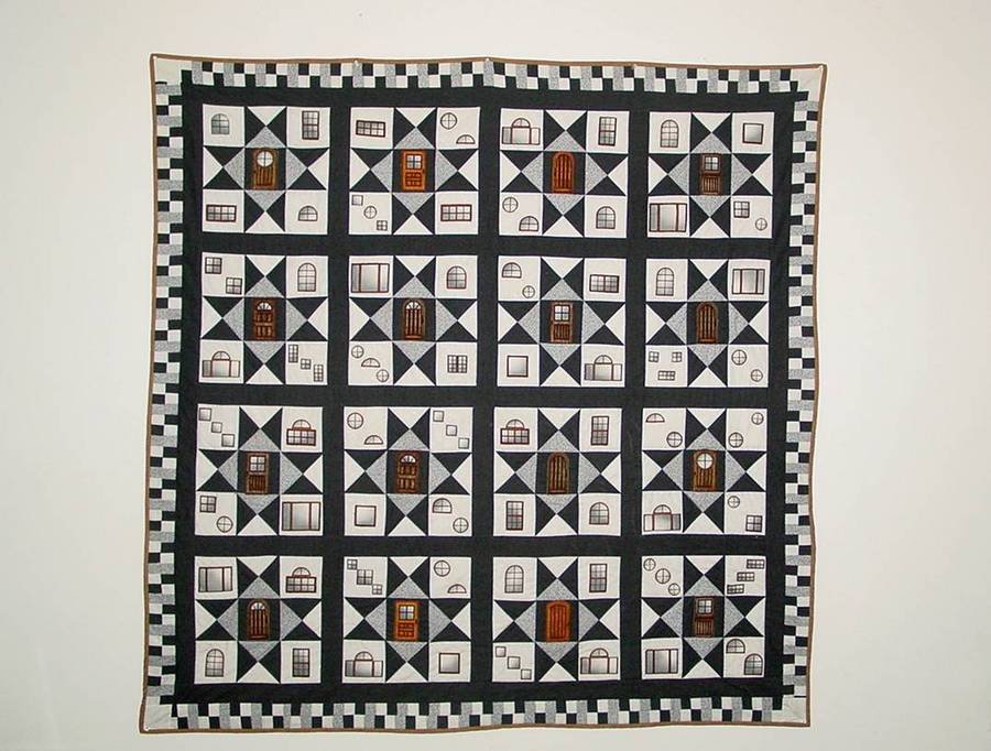 bbfho1 Door and Window Quilt - I made this quilt for our company- we make wcustom wood doors and windows and I found this fabric on Keepsake quilting web site. I fussy cut all the doors and windows out and appliqued them to the ohio star blocks. The quilt hangs proudly at our shop... and also is the background for our picture on our B&B doors we site.