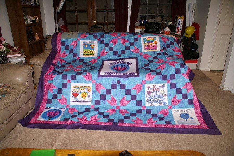 lzwhitehead Wild Thang on the Road to Oklahoma - This quilt was made using teeshirts from various ballooning events around the country, the large balloon is "Wild Thang" which is owned and operated by the owner of this quilt - I needed a filler block and since the owner is originally from Oklahoma, the Road to Oklahoma block just fit. The colors of the block are from the balloon. This photo is of the top before it was quilted.