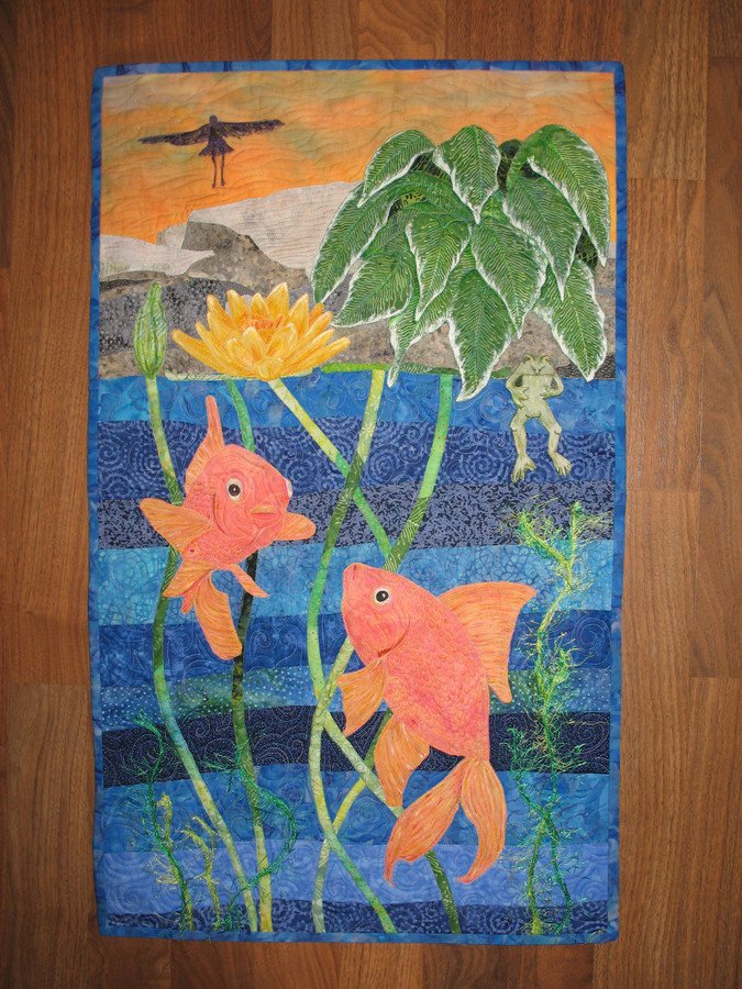 Bridget473 A Pond with A View - I have several goldfish and some volunteer frogs who live in my backyard pond. This quilt is a representation of my pond and its inhabitants. The background is pieced -- including the water lily "stems" -- and the remaining pieces are machine appliqued. I learned how to marble fabric while making this quilt and used the marbled fabric for the goldfish.