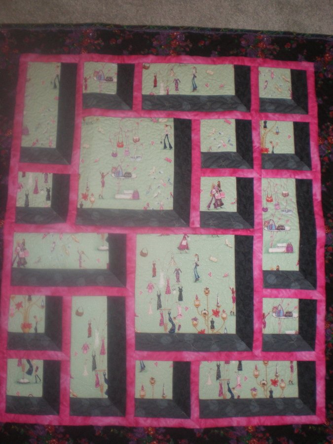 KonoJean Girls Just Wanna Have Fun - I took a class with Susan Cleveland. We fussy cut large prints for the insets. It was a good study in dark and light shadow contrasts. Everyone's quilts turned out entirely different.