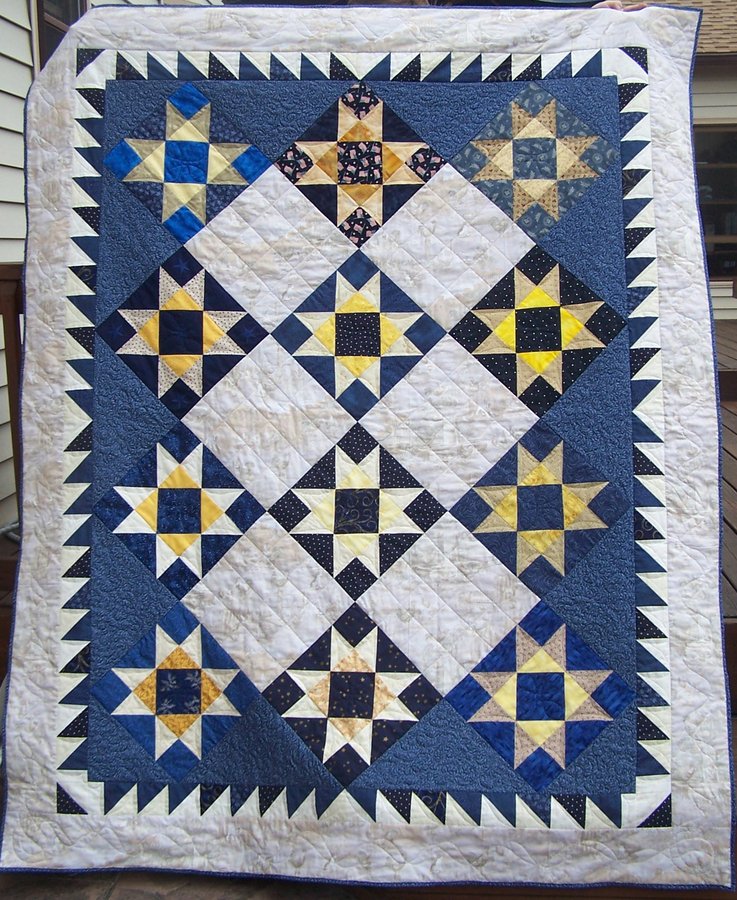 NancyAnn1959 St. Louis Stars - I was in a block exchange of a different style. Each participant picked the block and colors that the others would make for her. I requested navy, gold and beige. I found the setting in the book Sensational Settings. My friend Kathy, brought the exchange idea with her when she moved from St. Louis, hence the name. I made the center 2 blocks.