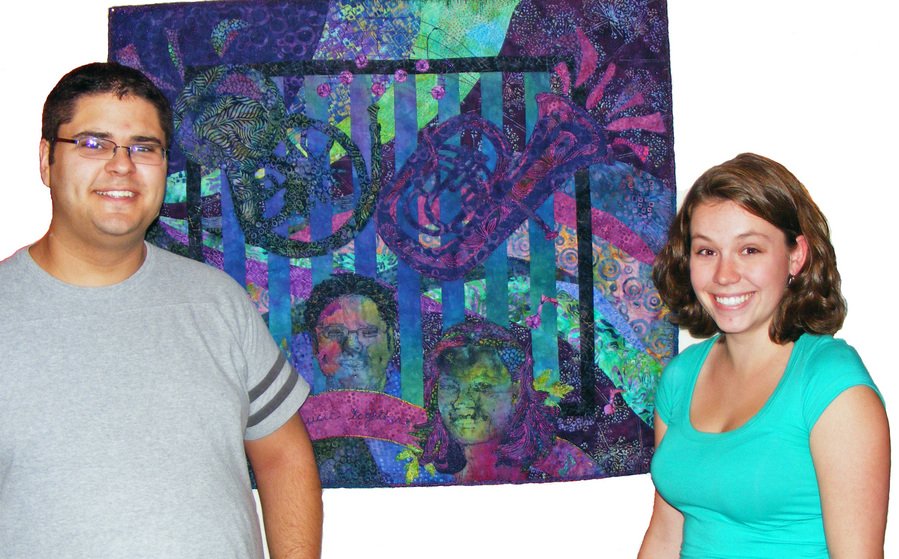 fiberwoman Making Beautiful Music Together - Wedding gift for niece and her hubby. They are both musicians, thus the french horn and euphonium depicted in the quilt. The converged curves are meant to suggest the movement of music, thus the title "Making Beautiful Music Together". Those words are also stitched onto the banner at the bottom. The stylized notes are from the music they used for their recessional; I only did one measure, as the first 6 measures are the same - AND I only had so much room *_*