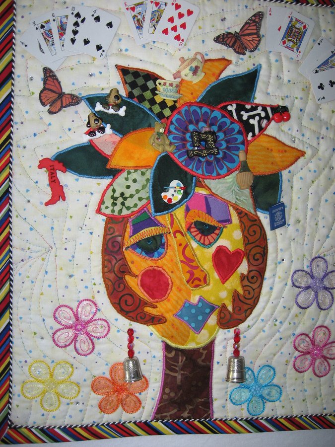 | Design Source - Description | Self portrait embellishing with my hobbies such as, playing bridge, raising monarch butterflies, computers, quilting, taking pictures, ect. |